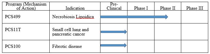 The table below summarizes the current status and anticipated milestones of our product development programs. We have completed the patient portion of our Phase 2A clinical trial for PCS499, however, due to the global outbreak of a novel strain of the coronavirus (COVID-19), the finalization of the trial data and its closeout has been delayed.