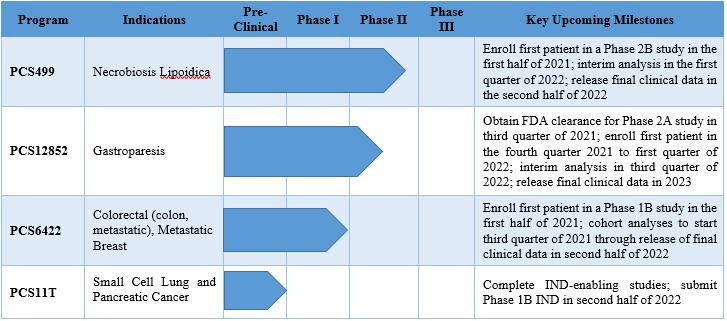 The funding necessary to bring a drug candidate to market is subject to numerous uncertainties. Once a drug candidate is identified, the further development of that drug candidate may be halted or abandoned at any time due to a number of factors. These factors include, but are not limited to, funding constraints, safety or a change in market demand. For each of our drug candidate programs, we periodically assess the scientific progress and merits of the programs to determine if continued research and development is economically viable. Some programs may be terminated due to the lack of scientific progress and lack of prospects for ultimate commercialization. As noted above, we anticipate our research and development costs to increase in the future as we conduct the Phase 2B trial to evaluate the ability of PCS499 to completely close ulcers in patients with NL and begin a Phase 1B clinical trial for PCS6422. We expect to begin recruiting patients for these two clinical trials during the second quarter of 2021.