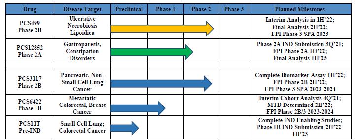 | ● | PCS12852 is a highly specific and potent 5HT4 agonist which has already been evaluated in clinical studies in South Korea for gastric emptying and gastrointestinal motility. We are planning on submitting an IND application in the third quarter of 2021 (3Q’21) for the treatment of gastroparesis based on our pre-IND communications with the FDA. We anticipate beginning to enroll patients for a Phase 2A trial in the 1H’22, with expected completion in the first half of 2023 (1H’23). | |