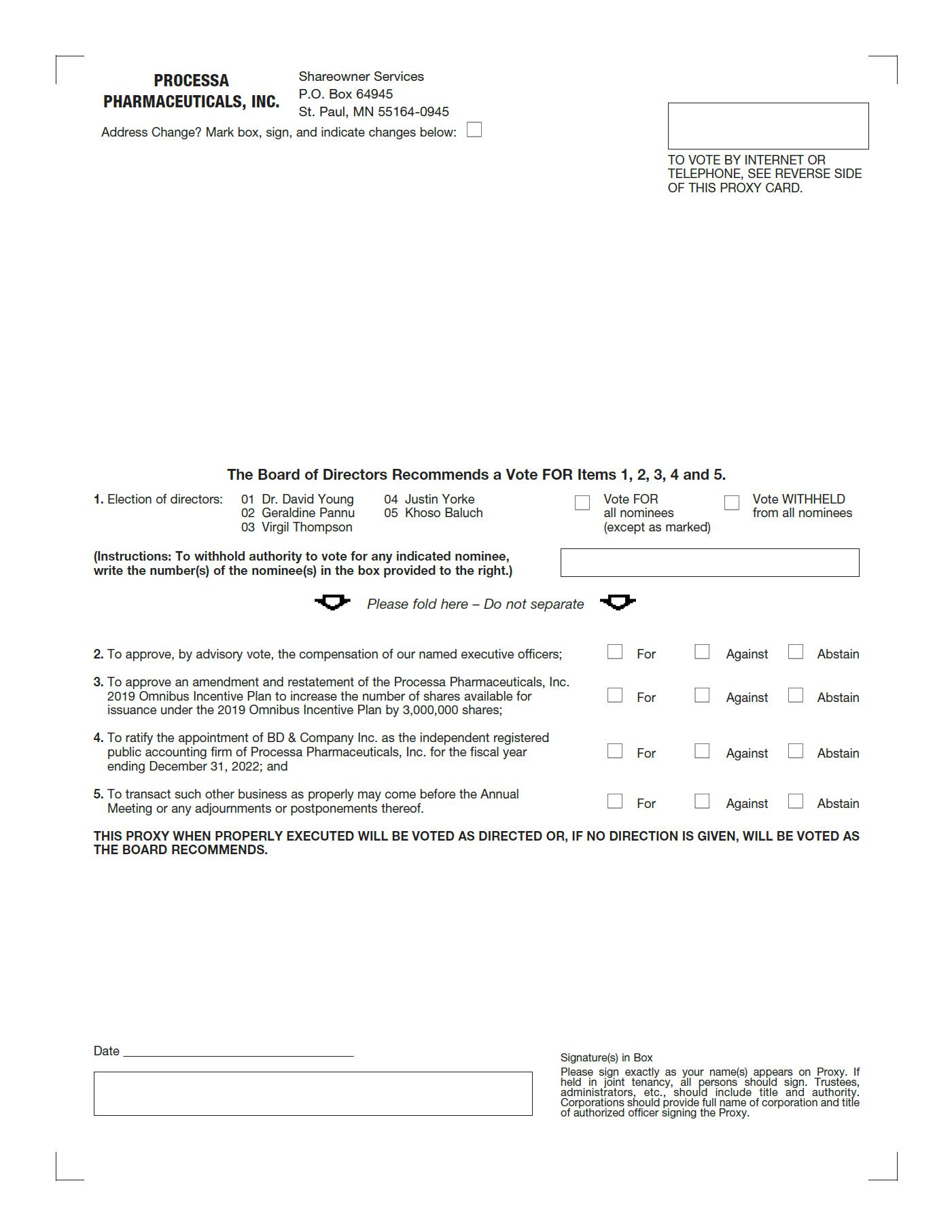| 3. | To approve an amendment and restatement of the Processa Pharmaceuticals, Inc. 2019 Omnibus Incentive Plan to increase the number of shares available for issuance under the 2019 Omnibus Incentive Plan by 3,000,000 shares; | |