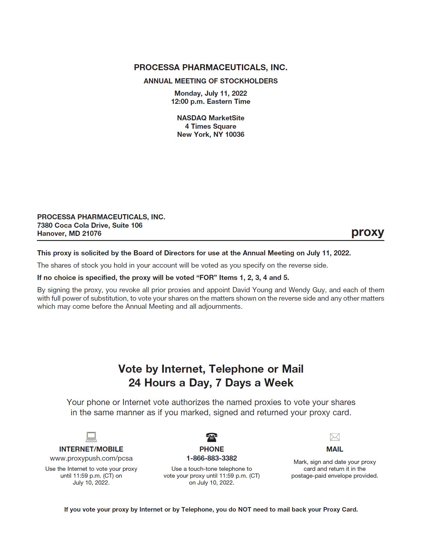 NOTICE HEREBY IS GIVEN that the 2022 Annual Meeting of Stockholders of Processa Pharmaceuticals, Inc. will be held at the Nasdaq MarketSite, 4 Times Square, New York, NY 10036, on Monday, July 11, 2022, beginning at 12:00 p.m., Eastern Time. The Annual Meeting will be held for the following purposes: