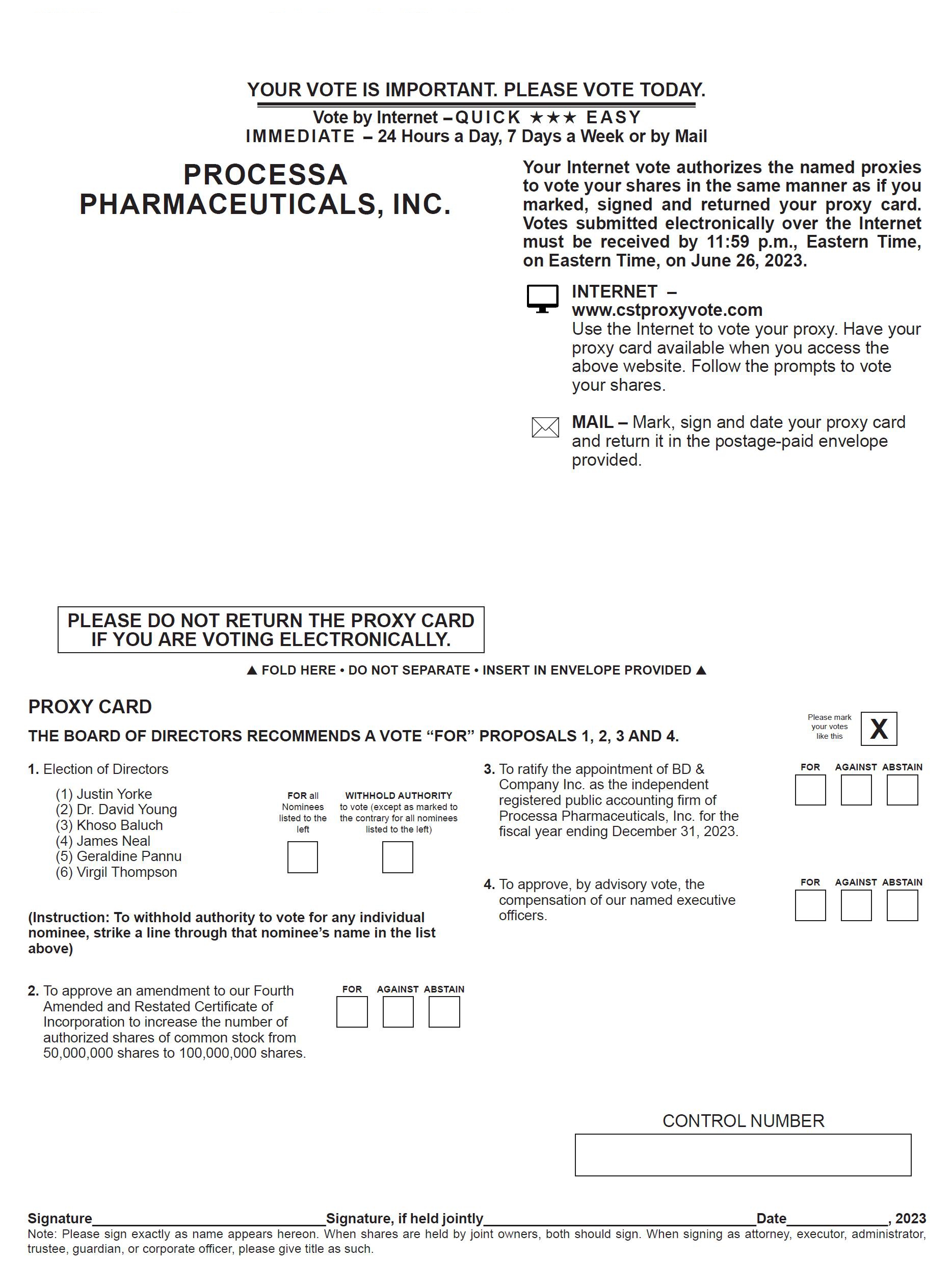 NOTICE HEREBY IS GIVEN that the 2023 Annual Meeting of Stockholders of Processa Pharmaceuticals, Inc. will be held at our corporate office located at 7380 Coca Cola Drive, Suite 106, Hanover, MD 21076 on Tuesday, June 27, 2023, beginning at 12:00 p.m., Eastern Time. The Annual Meeting will be held for the following purposes: