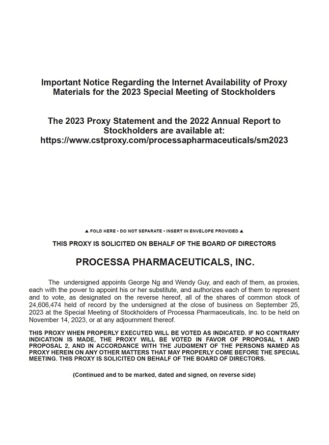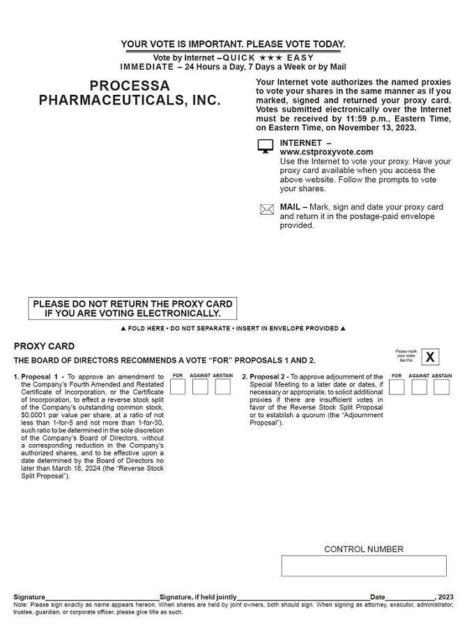 NOTICE HEREBY IS GIVEN that a Special Meeting of Stockholders of Processa Pharmaceuticals, Inc. will be held at 7380 Coca Cola Drive, Suite 106, Hanover, MD 21076, on November 14, 2023, beginning at 1:00 pm, Eastern Time for the following purposes: